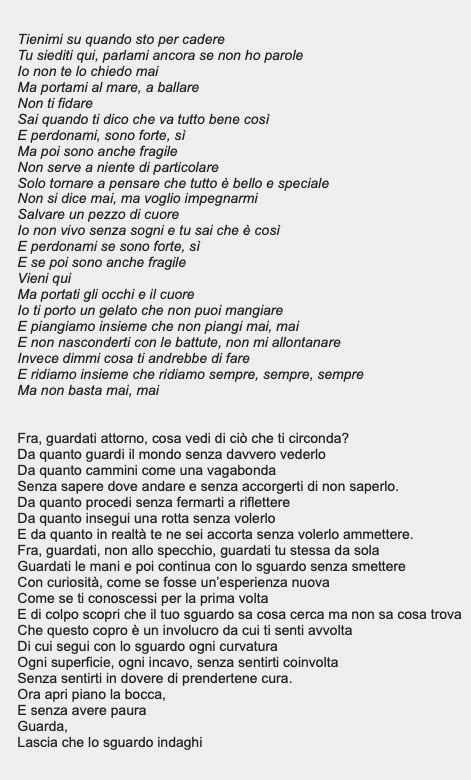 creative practice PAST PROJECTS CONVERSATIONS WITH A SONG Conversation with a Song is a short series consisting of three video performances in Italian, interlacing Slam Poetry to Video Art and Performance. The poems dialogue with three very popular songs but each text and meaning is reinterpreted – or, perhaps, expanded. In this way, the conversation with Hey Jude allows for a discussion of mental health and depression, the one with The House of the Rising Sun opens a space to rethink addiction, and the one with the famous Italian song Giardini di Marzo offers a way to reimagine physical illness and the relationship to one’s own body. In all three poems, language is symbolically the medium of these conversations but also ends up being the focus of their content: in fact, each conversation ends up questioning the role of language in how we imagine (and thus relate to) mental and physical illness. Finally, poetry is performed and translated into a video performance which adds a new layer of signifcance. Interdisciplinarity and intermediality are at the core of these videos in which word, image, performance and symbolism all wish to dialogue with each other. Episode 1 • “Hey Jude” My conversation with Hey Jude (The Beatles, 1968) allows for a discussion of mental illness, depression, and the importance of language in redefining how we relate to them. Episode 2 • “The House of the Rising Sun” My conversation with the traditional song The House of the Rising Sun opens a space to rethink addiction as an illness often dealt with through the wrong means. Episode 3 • “Giardini di Marzo” This conversation with the famous Italian song Giardini di Marzo offers a way to reimagine the presence of illness in one’s own body. WORK IN PROGRESS